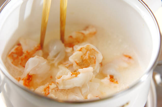 小鍋にエビ、酒を入れて中火にかけ、汁気がなくなるまで炒り煮し、ザルに上げて冷ます。
