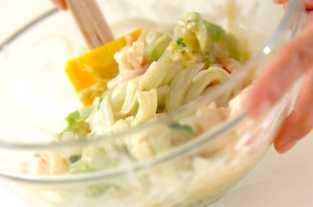<からしみそダレ>に白菜、(1)のエビを加えて和え、器に盛り分ける。