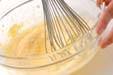 <レンジカスタード>を作る。耐熱ボウルに卵黄、グラニュー糖を加えて泡立て器で白っぽくふんわりとなるまでよく混ぜ合わせ、牛乳、薄力粉を加えて更にしっかり混ぜ合わせる。