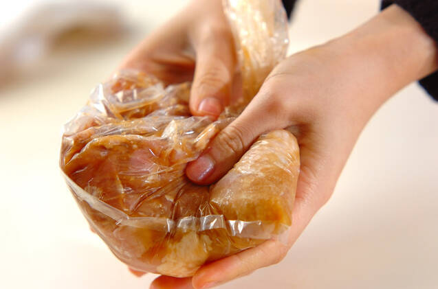 <下味>が入ったビニール袋に鶏もも肉を入れてよくもみ込み、20分以上漬けておく。