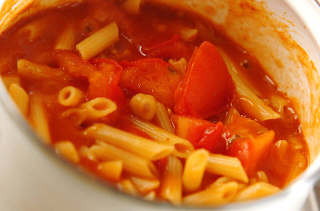 蓋を外して強火でソースを煮詰め、オリーブ油、粉チーズ、塩、粗びき黒コショウで味を調える。火を強めてお弁当箱に入れ、バジルをちぎって散らす。