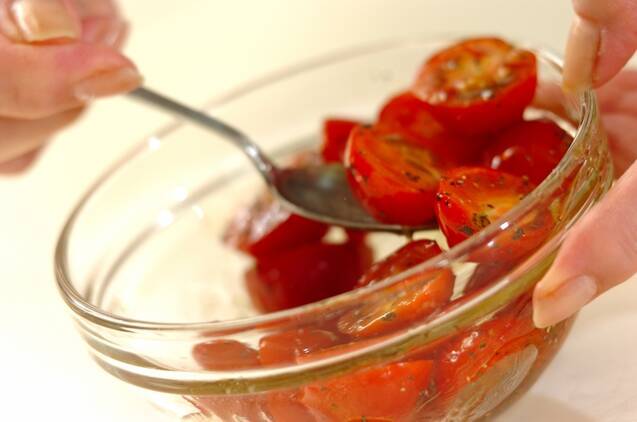 <C>のプチトマトは横半分に切り、その他の材料と合わせる。バゲットの上にのせ、器に盛る。