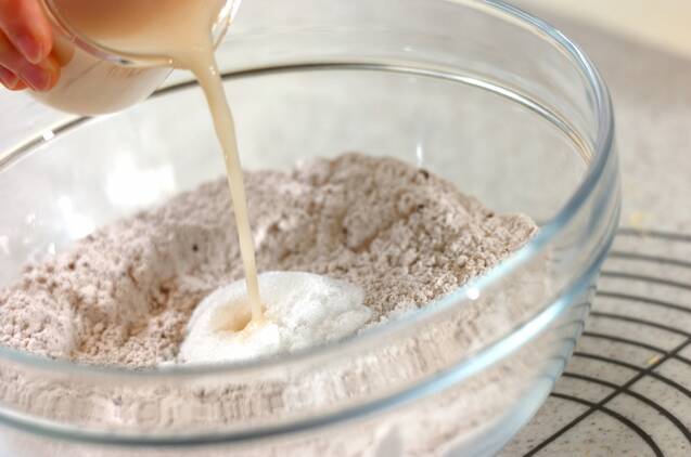 ボウルに強力粉、ココアパウダー、塩を入れ、泡立て器で混ぜ、砂糖を入れる。イーストを溶かした水、溶き卵を砂糖めがけて注ぎ入れ、カードで混ぜる。