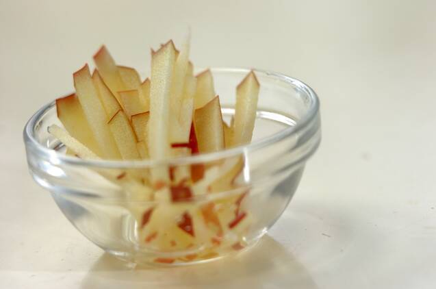 リンゴは半分のくし切りにし、ひと切れは皮ごと薄いくし切りにし、皮が残るようにさらに細切りにして水に放つ。