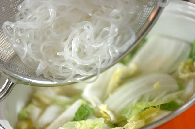 鍋にゴマ油大さじ1を熱し、鶏ささ身を炒め、薄く焼き色がついたら<スープ>の材料を入れ、煮たったら白菜と春雨を加える。