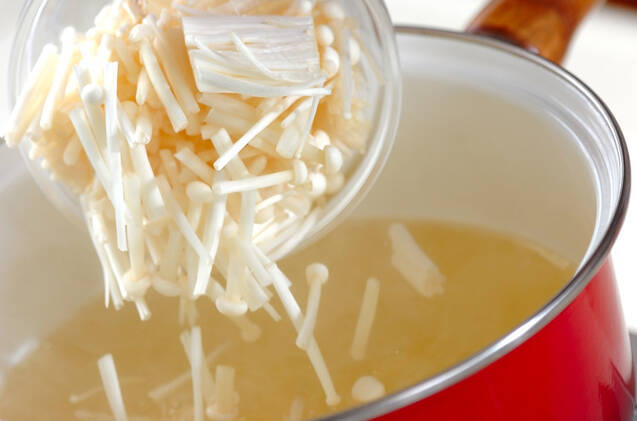 鍋にだし汁を入れて中火にかけ、煮立ったらエノキ、生シイタケを入れて、しんなりするまで煮る。