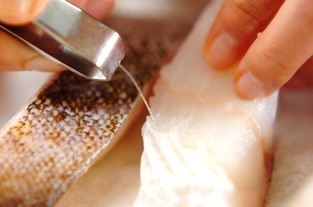 甘塩タラはザルに並べ、熱湯をかけて臭みを抜き、水気を拭き取って骨を抜き、1切れを3つに切る。