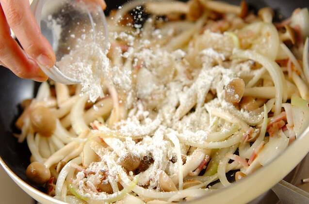 残りのバターを加えてベーコン、玉ネギ、シメジを炒める。玉ネギがしんなりしたら小麦粉を振り入れ、粉っぽさがなくなるまで炒め合わせる。
