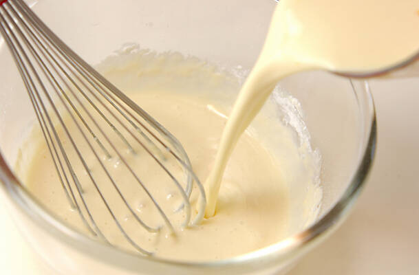 薄力粉のボウルに合わせた卵牛乳を少しずつ加えながら、ダマにならないように泡立て器で混ぜ合わせる。溶かしバターを加えて混ぜ、網でこし、ラップをして冷蔵庫で1時間以上寝かせる。