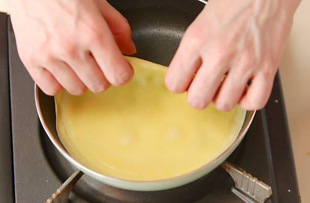 生地のふちが色づいてくれば生地をひっくり返し、乾かす程度にサッと焼く。同様に12枚分のクレープを焼き、1枚を4つにたたむ。