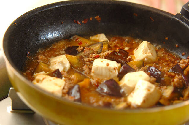 ナスがしんなりしたら<調味料>を加え、煮たったら豆腐を加えて豆腐が温まるまで煮る。
