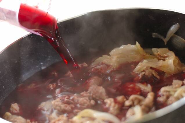 牛肉の色が変われば、小麦粉を加えて全体に炒め合わせ、粉っぽさがなくなり、しっとりすれば赤ワインを加える。時々木ベラで混ぜながら、中火で赤ワインの量が半量になるまで煮込む。