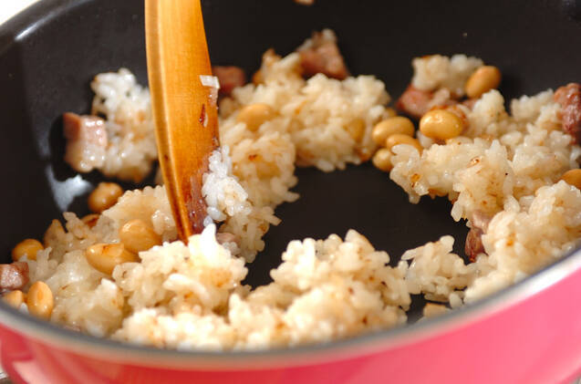 ご飯を加え、ポロポロになったら水煮大豆を加えて炒め合わせ、塩、ドライパセリで味を調える。