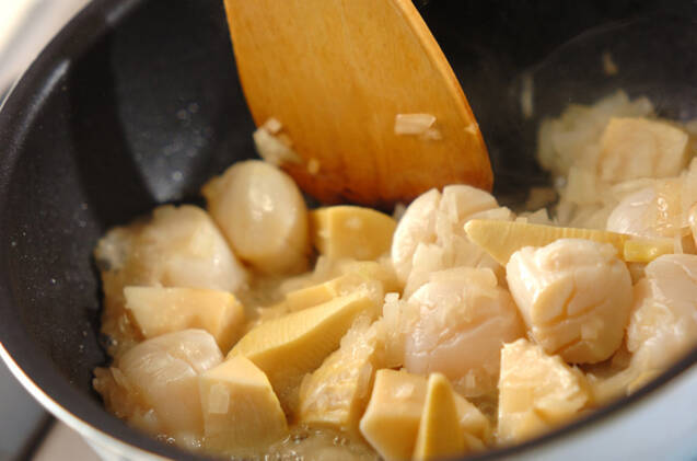 フライパンにオリーブ油を入れて火にかけ、水煮タケノコ、ホタテ、玉ネギを加えて炒める。玉ネギがしんなりしたら、白ワインを加えてさらに炒める。