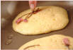 <生地>にプツプツと穴があきだしたら、桜花をのせてひっくり返し、ごく薄く焼き色をつける。