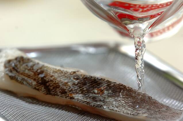 タラは骨を抜き、ザルにのせて熱湯をまわしかける。キッチンペーパーで水気を拭き取り、ひとくち大に切る。