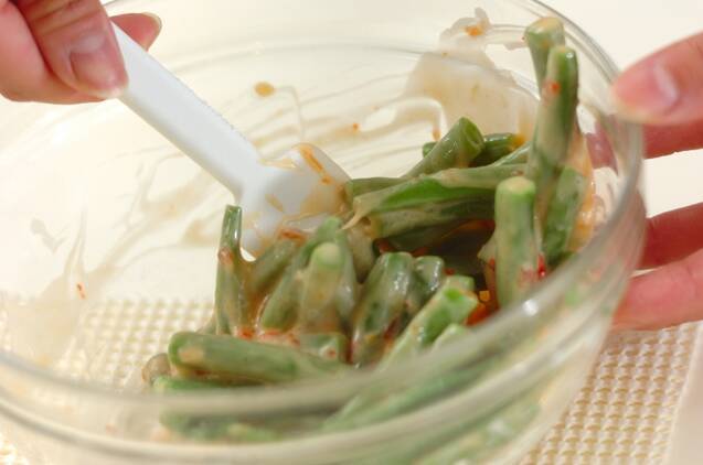 サヤインゲンを長さ3等分に切り、<調味料>で和え、器に盛る。