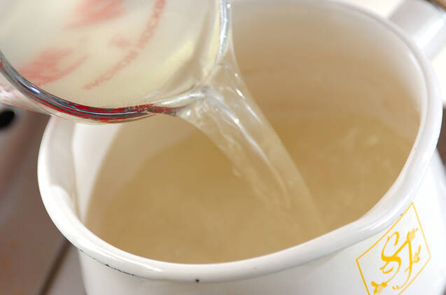 鍋にゆで汁を入れ、火にかける(400mlない場合は、分量外の水を足して下さい)。