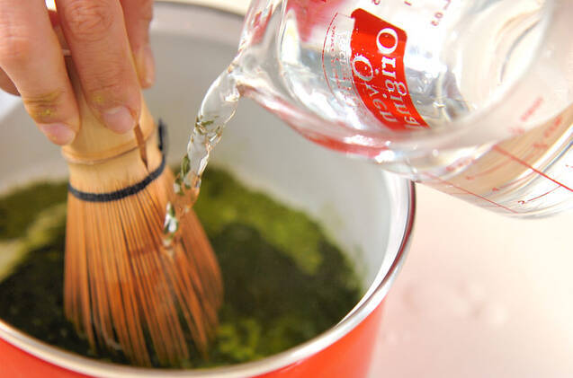 小鍋に抹茶を入れてお湯を少しずつ入れて溶き、砂糖を入れて中火にかけ、混ぜながら砂糖を煮溶かす。