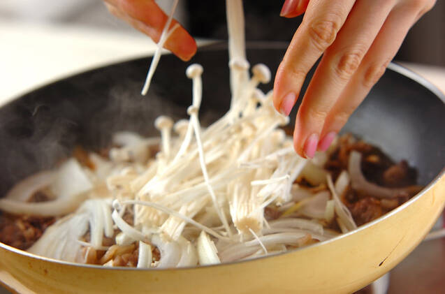 煮汁が少なくなったら玉ネギ、エノキを加え、さらに煮汁がほとんどなくなるまで煮詰める。