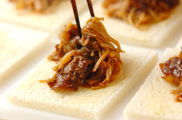 食パンの片面に薄くバターをぬり、バター側を上にしてパンを置き、中央に(2)を1/8量のせて、パンの縁に<小麦粉のり>を1周薄くつけ、もう1枚パンのバター側が下になるように重ねて縁をフォークなどでしっかり押さえる(8個作る)。