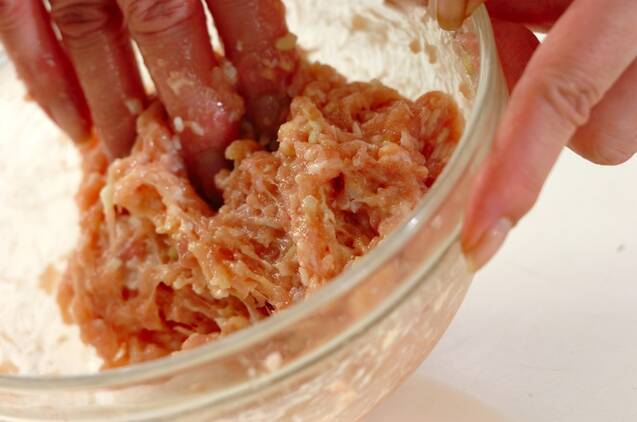 <鶏団子>を作る。ボウルに鶏ひき肉と塩を加え、粘りがでるまで混ぜる。ショウガ、卵を加え、ぽってりとするまで混ぜる。白ネギと片栗粉を加え、混ぜ合わせる。
