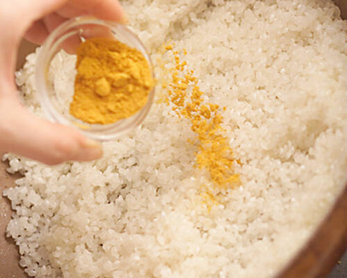 フライパンにサラダ油を熱し、洗った米を中火で透き通るまで炒める。ターメリックを加えて炒めあわせ、炊飯器に入れる。