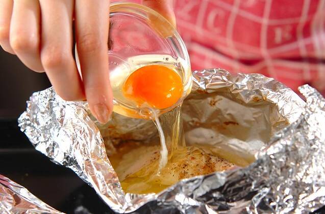 いったん取り出し、アルミホイルの上部を開けて卵を割り入れ、再びオーブンに入れて、お好みの半熟状態になるまで焼く。今回は250℃で3分焼きました。器にのせ、お好みで塩やしょうゆをかけて下さい。