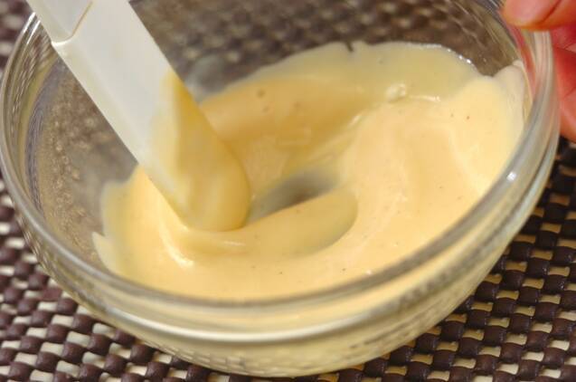 <ドレッシング>の材料をボウルに入れ、混ぜ合わせる。