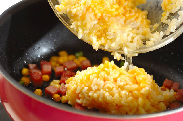 全体に炒められたら、卵を混ぜ合わせたご飯を加えて炒める。パラパラになったら<調味料>の材料を加えて味を調える。