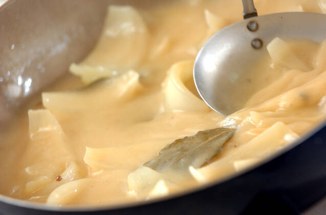 レモンの輪切りを取り出し、白ワインを加えて煮たたせ、火を少し弱めて15分煮る。いったん鶏肉を取り出し、水で溶いたコーンスターチを加えてトロミをつける。
