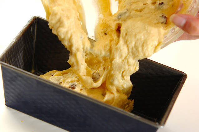 (1)のボウルに振るったホットケーキミックスを入れ、泡立て器からゴムベラに変えてサックリと混ぜ、バナナと天津甘栗も加える。全体に混ざったら、パウンド型に入れて170℃に予熱しておいたオーブンで50分焼く。表面が焦げそうな場合は、アルミホイルをかけて下さい。