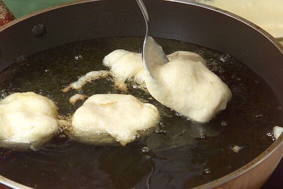 バナナの水気をキッチンペーパー等で少し押さえ、<衣>をくぐらせ、170℃の揚げ油に入れ、キツネ色になるまでサッと揚げる。
