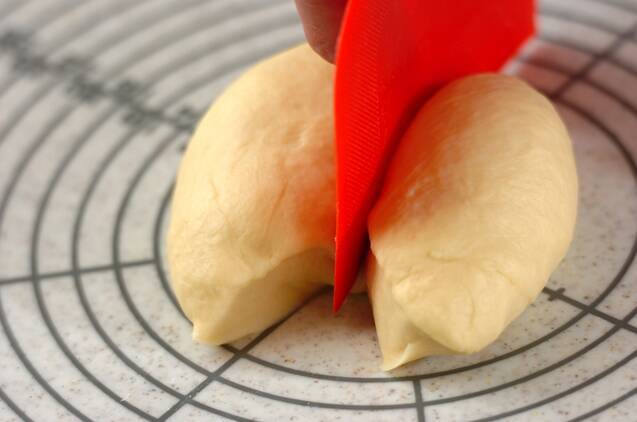 生地の表面がなめらかになったら、生地を2分割して丸め直し、ひとつは閉じ目を下にしてボウルに入れてラップをかける。