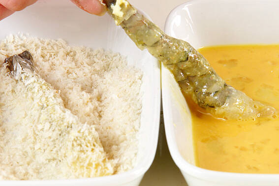 塩、コショウをし、小麦粉、溶き卵、パン粉と<衣>をつける。ここまで前日に作って、冷蔵庫に入れておいてもいいですね。