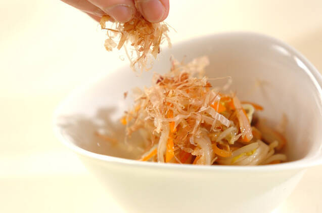ボウルで<ドレッシング>の材料を混ぜ合わせる(ツナ缶はつけ汁ごと加える)。(1)とカニ風味カマボコを混ぜ合わせて器に盛り、かつお節をふんわりかける。