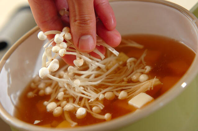 鍋に<スープ>の材料を入れて強火で熱し、煮たったら、エノキ、豆腐を加える。