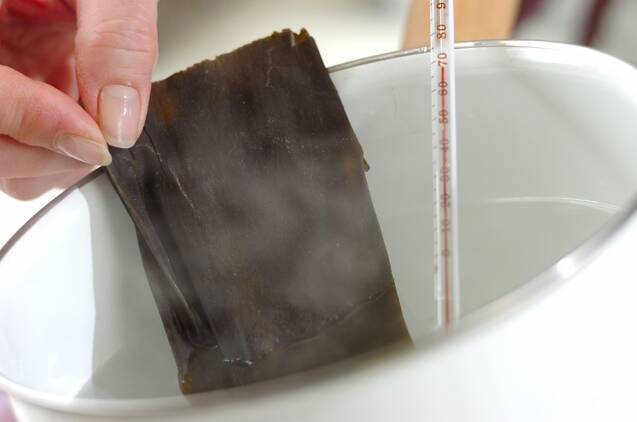 <昆布カツオだし>を作る。分量の水を鍋に入れ、60~70℃まで加熱したら昆布を入れ、火を止めて1時間置く。