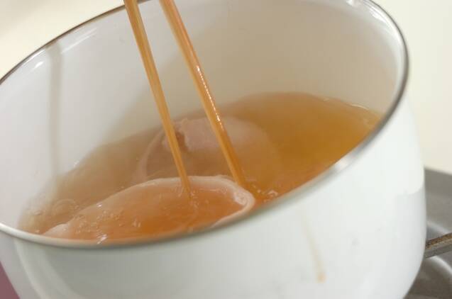 <昆布カツオだし>に<味付け>の酒を入れ、強火で加熱する。沸騰直前に火を弱め、豚バラ肉を入れてサッととゆでて取り出す。白だしと塩を入れ、味を調える。