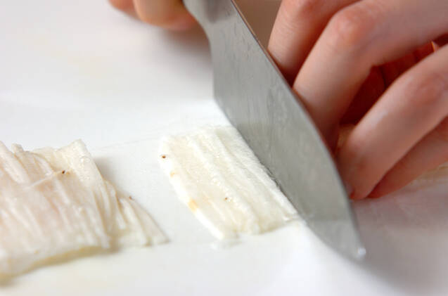 長芋は皮をむき、キッチンペーパーなどでぬめりを拭き取り、縦せん切りにする。スライサーで薄切りにして切るとせん切りにしやすいですよ!