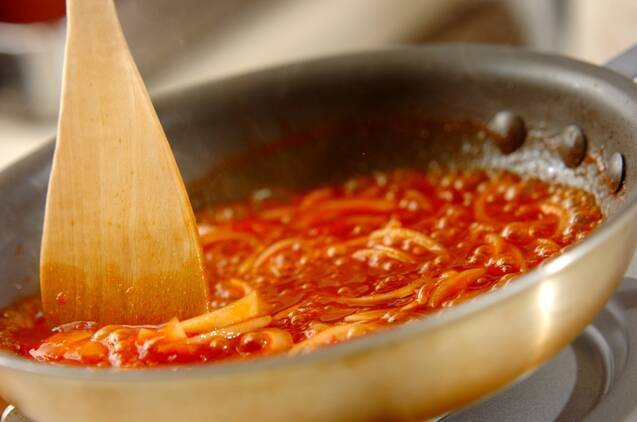 <ハンバーグ>を取り出し、同じフライパンに玉ネギを入れて、しんなりするまで炒める。他の<ソース>の材料を加えてトロミがつくまで煮詰める。