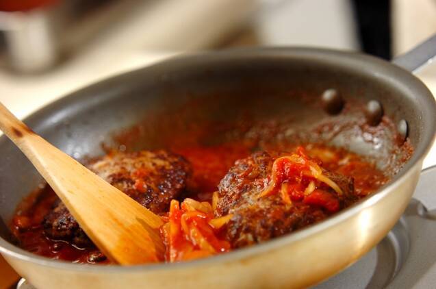 別のフライパンにサラダ油を熱し、目玉焼きを作る。<ソース>のフライパンに<ハンバーグ>を戻し入れてからめる。