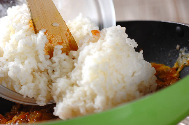 フライパンにオリーブ油を入れて豚ひき肉、玉ネギを炒め、<調味料>を加える。全体に炒められたら卵を加え、卵が半熟になったらご飯を加えて更に炒め合わせ、器に盛る。