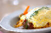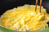 フライパンにオリーブ油を入れて強火にかけ、2の半量の卵を一気に流し入れ、菜ばしで混ぜながら柔らかめの半熟にまとめて火を止める。