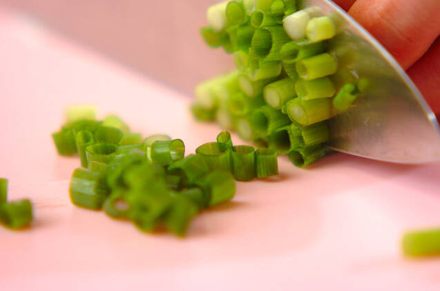 細ネギは水洗いして根元を切り落とし、幅5mmくらいの小口切りにする。(3)の<和風タラコソース>にマヨネーズを混ぜ合わせる。<ワンポイントアドバイス>スパゲティーのゆで上がりと、ソースができるタイミングが合えば、最高です!