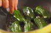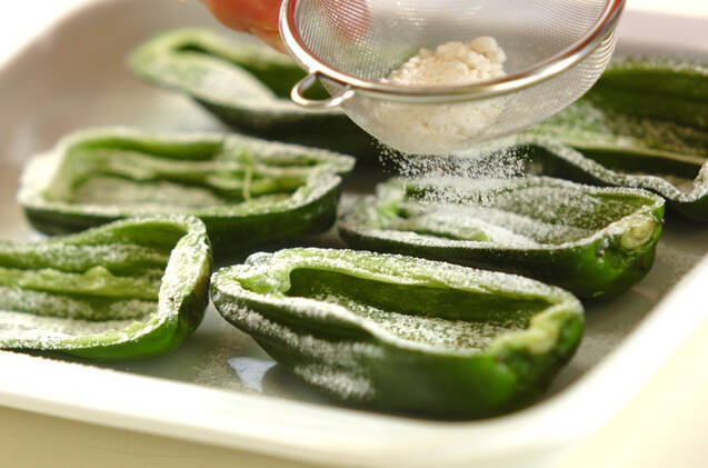 ピーマンは縦半分に切って種を取り、内側に小麦粉を振る。