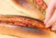 4のパンに<カレーキャベツ>を詰め、ウインナーソーセージをのせ、<トマトソース>、マスタードをかける。