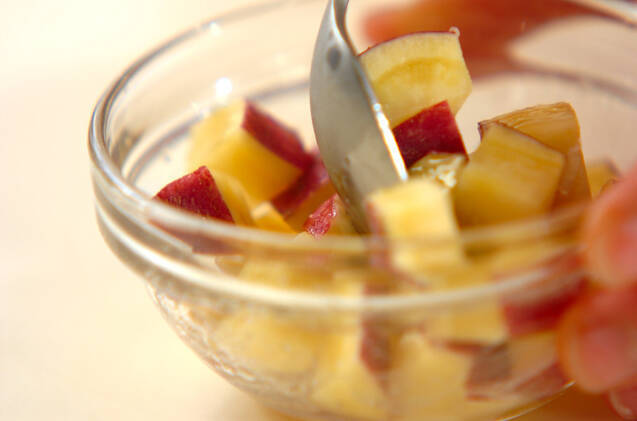 柔らかくなったら取り出し、熱いうちに塩を振ってその他の材料と混ぜ合わせ、アルミカップに詰める。