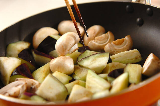 フライパンにオリーブ油を強火で熱し、ナス、マッシュルームを炒め合わせる。