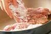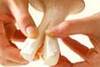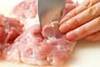 鶏もも肉は身の厚い部分に切り込みを入れ、皮側を包丁の先で軽く刺し、塩コショウを軽く振る。